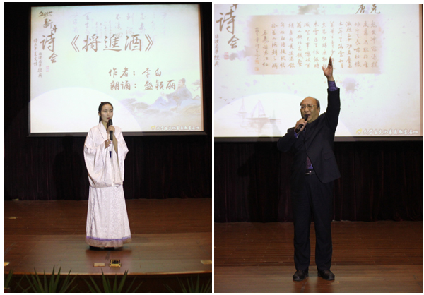 琴弦悠悠,诗声朗朗,诗会在校民乐队《步步高》的乐曲声和曲调优美抒情、委婉动听的合唱《晚风》中拉开帷幕。诗会分“一曲新词酒一杯”、“笙歌竞奏汉宫春”等四个篇章,分别演绎了中国古典诗词等传统文化经典。如李白的《蜀道难》、苏轼的《念奴娇•赤壁怀古》、张若虚的《春江花月夜》、陆游的《钗头凤》、白居易的《长恨歌》、曹操的《短歌行》等等。其中,浙江广电集团主任播音员、国家级普通话水平测试员唐克更是以一首充满爱国精神饱含英雄气概的《满江红》掀起本次诗会的高潮。在充满中国古典诗词文化的典雅气氛中,来自孟加拉国的留学生王力和来自乌克兰的留学生法提玛与和风文学社的同学《摸鱼儿•雁丘词》,在用汉语朗诵经典的同时,他们用丰富的表情和形象的肢体语言向大家展示了对这首词的理解和认识,轻松而又自然,舒畅而又美好,极富感染力,赢得了全场的掌声。来自我校安吉校区的同学首次参加新年诗会,他们特意排练了诗朗诵《透过历史的眼眸》和《念奴娇•赤壁怀古》,表现了大一新生崭新的精神面貌和对文化经典的热爱。