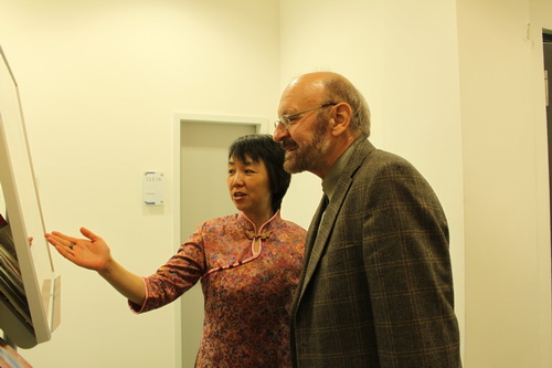 图2为德国埃尔福特孔子学院院长毕玫向客人介绍中国文化