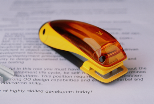 该项赛事以谋求艺术与文具产业有机结合为取向。由于不能判定装订无厚度是否超出装订极限,在普通办公订书机装订中经常出现失误,直接装订费时,“满载而归”订书机通过的附加小结构限制了装订纸张的厚度,提醒装订容量,这个小结构也抵齐了纸张,帮助装订更整齐。“满载而归”订书机外观设计灵感来源于出海捕鱼的渔船,色泽鲜艳。