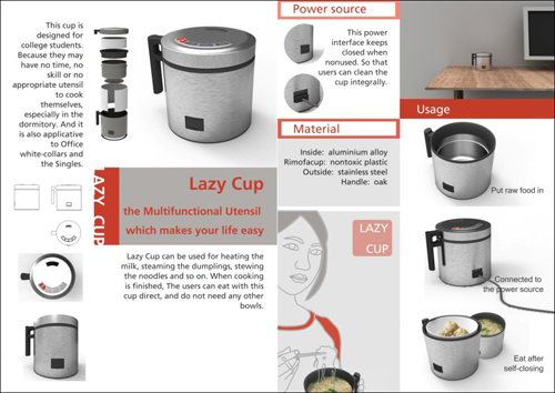 “LAZY CUP”在艺术学院朱吟啸老师指导下完成,是一款为大学生设计的杯子。大学生通常缺乏日常所需的烹饪技能,尤其在学生宿舍内,也没有足够的时间和合适的厨具来完成烹饪过程。Lazy Cup简单易用,在一定程度上解决了时间不够与技能不足的现实问题。此外,该款设计同样适用于白领与单身群体。他们可以使用Lazy Cup热牛奶、蒸饺、煮面等等。烹饪结束后也不需要将食物转移至其它餐具内,端起食用即可,方便、快捷,符合城市工作生活特点。在设计上不突出外造型突出满足使用人群最实际的需求。