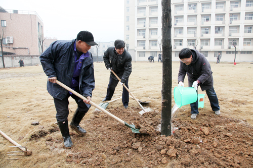 上午9时许,两级领导等一百余人来到东和公寓,他们自发地组成植树小组,合力把树苗移入坑中,移正竖直,再用铁锹培土、夯实。不一会儿,沿着大草坪栽下一棵棵行道树苗,也种下一份份希望。有的干部记下自己植树的位置,说“20年后再来看看这些树是很有意义的”。大伙儿干得热火朝天,一个多小时,在欢声笑语中种下了56棵碗口粗的香樟树苗。据悉,东和公寓是今年学校绿化的重点,植树节前后还将种下一批树苗。
