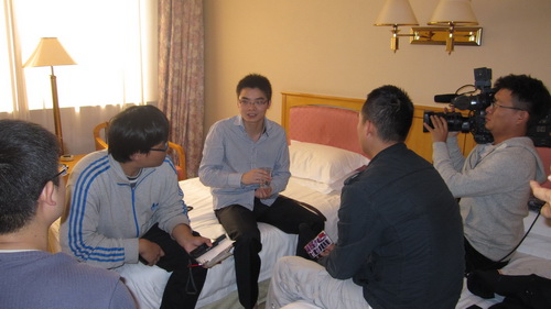 图为刘凯(居中)接受媒体采访。