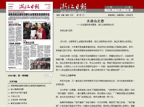 编后:2月20日浙江日报头版刊发了长篇通讯《大凉山之恋》,对全国优秀志愿者、“浙江最美教师”、我校青年女教师翁长庆的事迹进行了报道。