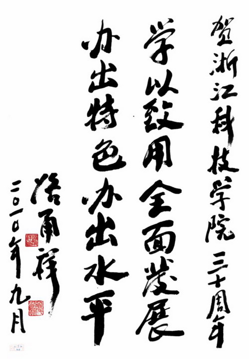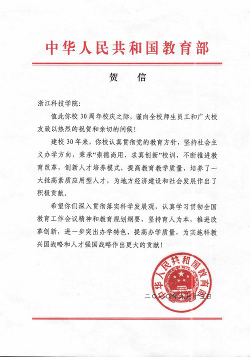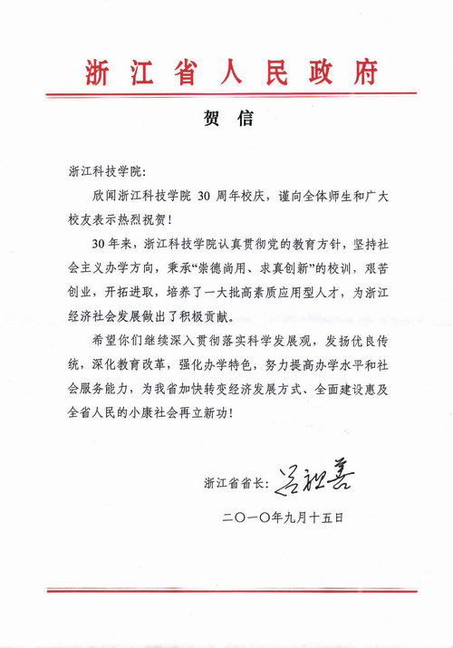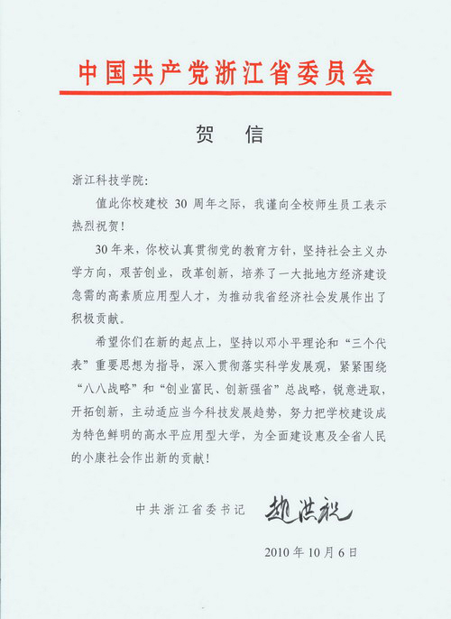 2010年10月,学校迎来30华诞。30年来,学校在浙江省委省政府的正确领导、上级领导亲切关怀以及社会各界的支持帮助下,各项事业取得了显著的成绩。在这喜庆的日子里,全国人大常委会副委员长、中国科学院院长路甬祥,中共浙江省委书记赵洪祝、省长吕祖善等领导,教育部等政府部门以及浙江大学等兄弟高校和社会各界纷纷发来题词、贺信,祝愿我校办出特色、办出水平,早日建成特色鲜明的高水平应用型大学。