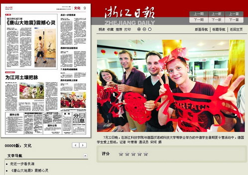 今年是中德学生暑期交流营活动第四次进行,仍然受到了中德学生的欢迎,德国布伦瑞克应用科学大学的学生也参加了活动。活动仍以促进中德学生交流为目的,着重加强中德学生之间在专业知识、语言、文化、社会生活等各方面的沟通了解。针对我校“2+3”项目学生,德国汉诺威应用科学大学和布伦瑞克应用科学大学教授及老师开设了电子技术、机械设计、艺术设计3个板块的专业课程和实验课。我校也针对德国学生开设了汉语、太极拳、烹饪等中国文化课程。课程之余,交流营还为学生们安排了参观沃尔夫链条公司及其它体验活动。浙江日报对夏令营活动进行了报道。