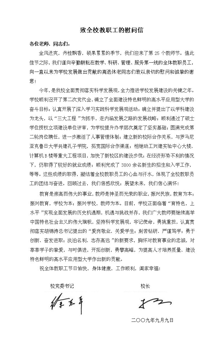 致全校教职工的慰问信