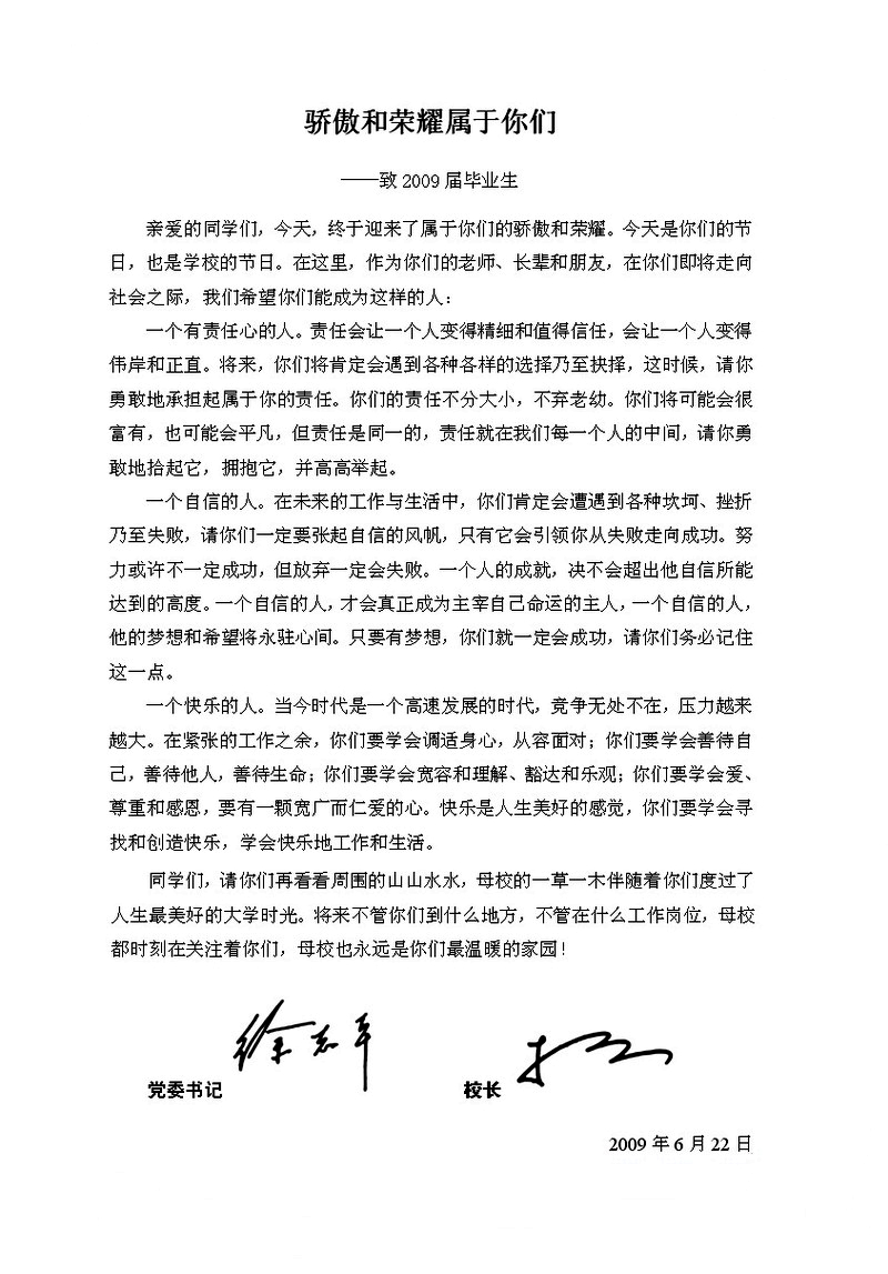 徐志平杜卫:骄傲与荣耀属于你们——致2009届毕业生