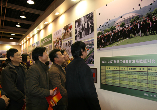 12月25日,理学院党总支组织全体教工党员和入党积极分子,并邀请部分党外人士参观了展览。在参观到《浙江教育事业发展》展板前,作为亲自参与者和建设者,大家更加关注和感慨。教师们也深深感受到,只有加快改革和发展步伐,学校才能实现跨越式发展,也更加期待学校第二次党代会的召开,推动学校新一轮科学发展。