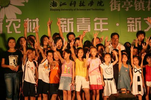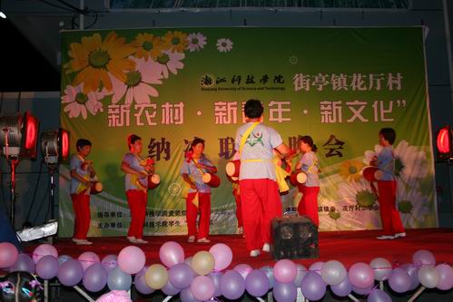 8月8日晚7:30,“新农村•新青年•新文化”纳凉联欢晚会在诸暨市街亭镇花厅村村办大楼篮球场隆重举行,校党委学工部副部长王静,街亭镇党委副书记张炳辉以及花厅村全体领导班子出席晚会,花厅村近400名群众以及全体夏令营学员观看演出。