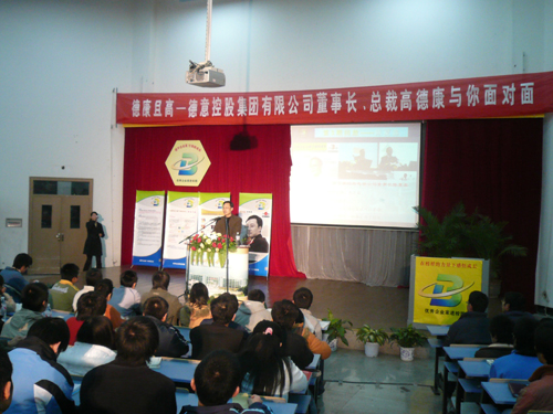 追求卓越,成就梦想。高德康向大学生们讲述了他从一家3000元资本、2名员工的小商店白手起家,凭着强烈的进取心和过人的胆识,经过14年的艰苦拼搏,使企业发展成10亿资产的大型现代化企业集团的创业历程。他指出:“志当存高远、德意竟一流,始终积极保持进取的精神,并辅以清晰坚定的思路和扎实有效的行动,成功就是必然的”。