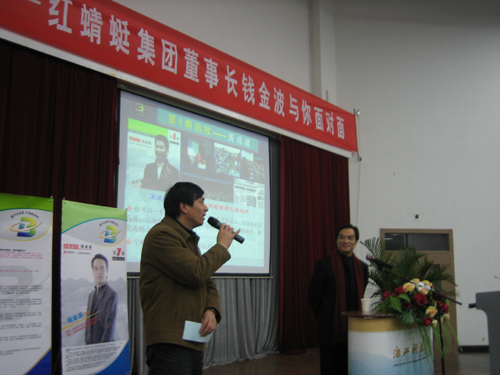 12月13日晚,第7期“握手企业家,引领新成长”优秀企业家报告会在A4-122举行,报告厅聚满了闻讯赶来的800多名师生,中国五四青年奖章获得者、中国鞋文化第一人、红蜻蜓集团董事长钱金波与我校师生进行了一场别开生面的精彩交流,校党委副书记陈浩主持了本次报告会。