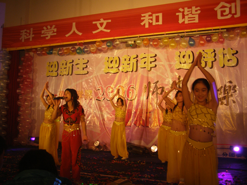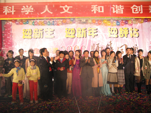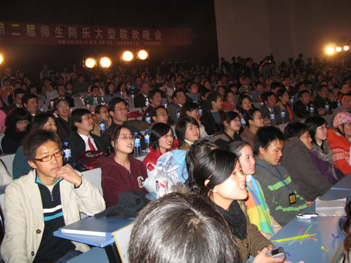 12月8日晚,小和山校区A4-122演讲厅内欢声笑语、暖意融融,伴随着时尚前卫、动感十足的街舞节拍,由生化学院举办的2006“迎新生 迎新年 迎评估”师生同乐大型联欢晚会拉开了帷幕。校党委副书记胡浙平、党委宣传部部长鲁维明、华丹公司韩总及校团委、理学院、中德学院、经管学院等部门、院系代表兴致勃勃地观看了演出。生化学院全体教师、全体新生和部分老生800余人参加了联欢晚会,得知消息的兄弟学院同学更是将A4-122挤得水泄不通。