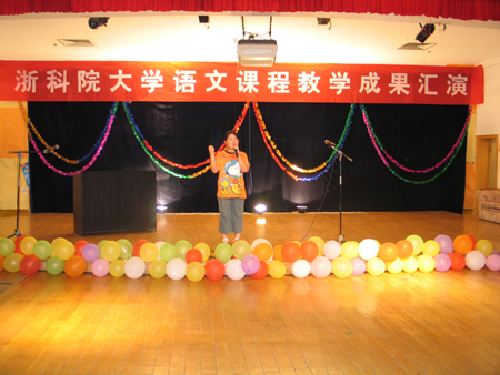 6月17日晚,大学生活动中心举办了别开生面的《大学语文》课程教学成果汇演。03外语系、经管系部分同学参加了优秀教学成果的汇演。汇演分为名诗朗诵、演讲、“故乡情”、“相约杭州”征文诵读、学术论文报告以及话剧表演等五个部分。