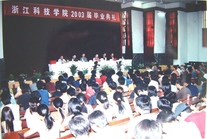 庄严神圣的国歌之后,院长沈莲清教授讲话。她首先代表学校党委和行政向2003届669名毕业生表示热烈的祝贺,并向为同学们成长付出辛勤汗水的教职员工表示衷心的感谢!沈院长结合学校近几年的快速发展,回顾了2003届学生的成长历程,深有感触地说,“03届学生是学校建校以来毕业生人数最多的一届学生,是最集中感受母校巨大变化的一届学生,也是为母校快速发展与母校同舟共济乐于付出的一届学生。”面对今年严峻的就业形势,沈院长对同学们不等不靠不挑不拣勇敢地选择参与竞争表示赞赏,相信同学们毕业后不论第一步走上哪个岗位,今后都会有光辉的前程,并祝同学们发达、成功!临别之时,沈院长将江泽民同志对大学生的五点希望赠与全体毕业生,希望同学们成为理想远大、热爱祖国的人;成为追求真理、勇于创新的人;成为德才兼备、全面发展的人;成为视野开阔、胸怀宽广的人;成为知行统一、脚踏实地的人。沈院长号召全体毕业生:“新世纪的中国经济需要千千万万个创业者,愿同学们勇敢地承担起建设祖国的神圣职责,把个人的成长融入到祖国的大事业中去,在实践中不断加强学习、磨练意志,发扬良好的协作精神和集体主义精神,以实际行动创造出无愧于时代和人民的业绩。”