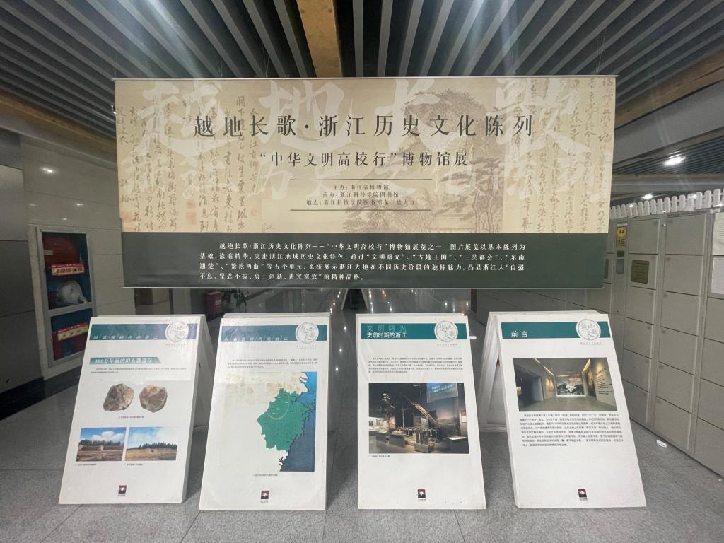 “越地长歌•浙江历史文化陈列”图片展以基本陈列为基础,浓缩精华,突出浙江地域历史文化特色,通过“文明曙光”、“古越王国”、“三吴都会”、“东南翘楚”、“繁庶两浙”等五个篇章,展现了浙江大地在不同历史阶段的独特魅力,凸显浙江人“自强不息、坚忍不拔、勇于创新、讲究实效”的精神品格。