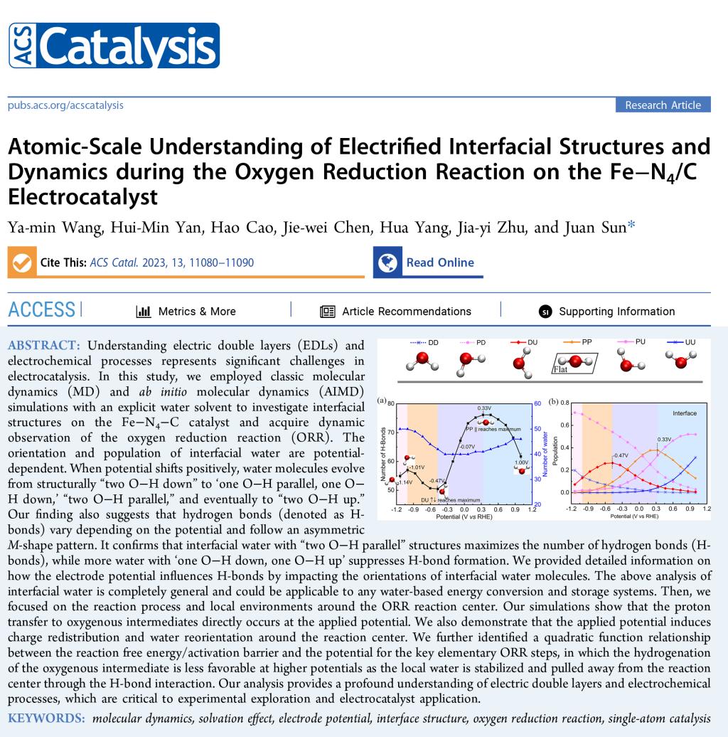 近日,生化学院制药团队以浙江科技学院为第一单位在国际权威期刊ACS Catalysis上在线发表了题为“Atomic-Scale Understanding of Electrified Interfacial Structures and Dynamics during the Oxygen Reduction Reaction on the Fe–N4/C Electrocatalyst”的论文。该论文第一作者为王亚敏博士,通讯作者为孙娟副教授,南方科技大学王阳刚副教授在课题讨论中给予建议与指导。