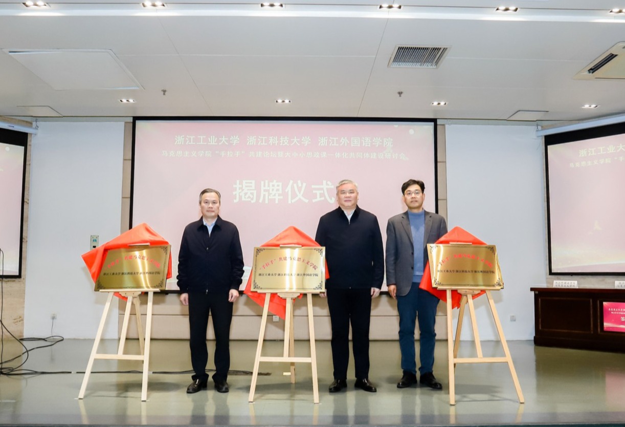 1230日,在杭高校马克思主义学院“手拉手”共建联盟启动仪式暨大中小学思政课一体化共同体建设研讨会举行。会上,我校党委副书记单胜道和浙江工业大学党委副书记陈杰、浙江外国语学院党委副书记赵文波共同为“手拉手”共建马克思主义学院揭牌。三所高校马克思主义学院负责人共同签署了“手拉手”共建联盟协议,并为思想政治理论课实践导师颁发聘书。