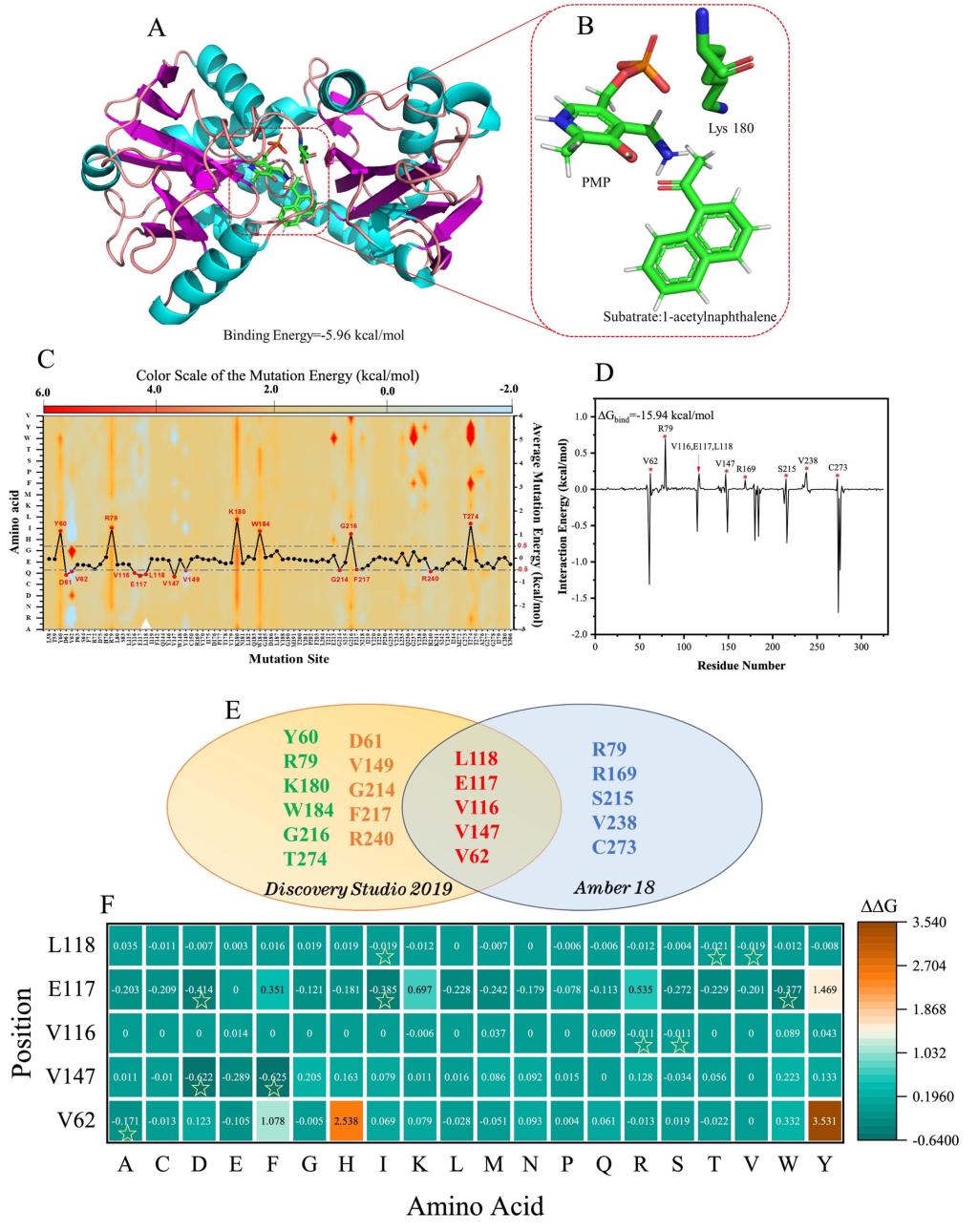 ω-转氨酶具有高立体选择性、反应条件温和、绿色环保等优势,在手性胺类化合物合成领域受到人们重视。然而,酶对非天然有机底物的低活性大大限制其应用。针对上述关键问题,研究团队从来源于土曲霉属的转氨酶AtATA出发,以1-乙酰基萘为模式底物,通过对酶与底物进行分子对接,并结合Discovery Studio、Amber、FoldX三种模拟软件,对酶与底物间的结合自由能进行计算分析,结合定点突变实验筛选得到五个有益单突变体。进一步通过组合突变实验获得了一个针对非天然模式底物具有活性与稳定性同步提升的五位点的组合突变体,该组合突变体对10种非天然有机底物的活性也得到相应提升。此方法打破传统定向进化方法中筛选工作量大的问题,将计算模拟与实验结合,大大加速了正突变体的获取效率。
