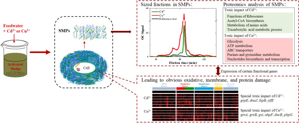 活性污泥法污水处理技术是目前应用最广泛的污水处理技术之一。重金属离子会显著影响活性污泥系统中微生物分泌溶解性代谢产物的分子组成及其含量,进而改变污水处理的出水水质,但其作用机制尚有待进一步揭示。我校净水控碳团队研究对比了二价镉离子(Cd2+)和二价铜离子(Cu2+)两种重金属离子影响微生物分泌溶解性代谢产物过程的分子生物学机制差异,发现Cd2+可使细胞内氨基酸代谢相关蛋白的表达上调,继而改变底物在代谢通路中的生化反应方向,致使代谢产物中各分子量有机物含量都上升,而Cu2+则可改变细胞中核糖核苷酸、嘌呤和嘧啶有关代谢活动的蛋白表达水平,影响遗传信息的转录、信号传递等生化反应过程,促进微生物分泌更多的中间代谢产物。这一研究成果为污水生物处理过程的运行与优化提供了有益参考。