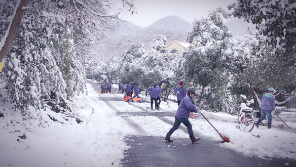 8日晚,校园积雪深度达到8CM,树枝已有明显积雪后弯压现象,后勤服务部领导班子带领党员、各中心骨干以及24小时留守待命的后勤员工在西和学生公寓、行政楼、图书信息大楼、各教学区开展人工树木敲雪工作,经过3小时的奋战,校园内主干道行道树、重点区域香樟等无明显积雪。为确保校区道路畅通,后勤组织人员于9日早上7点进行扫雪,根据雪情与地面结冰情况做好道路打雪、铲雪、除冰工作。对校园绿化进行巡查,根据积雪情况继续采取人工敲雪等措施,防止出现积雪低温凝冻累积,造成压断树枝危害师生、影响交通安全等情况。(后勤服务部 罗丹霞)