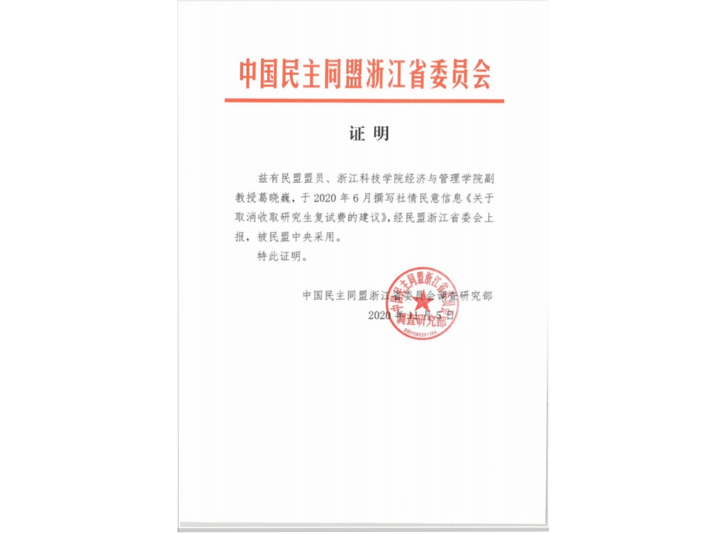 近日,我校民盟盟员、经济与管理学院葛晓巍老师撰写的社情民意信息《关于取消收取研究生复试费的建议》,被民盟中央采用。