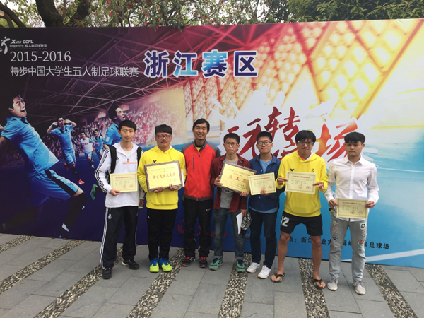 2016年4月8日,2015-2016特步中国大学生五人制足球联赛浙江赛区在浙江工业大学屏峰校区拉开序幕。本次比赛共有浙江大学、浙江工业大学等16支队伍参加比赛,我校足球队经过努力拼搏,最终夺得第五名,同时获得体育道德风尚奖。信息与电子工程学院李彦博闻和冯栋获得优秀运动员。
