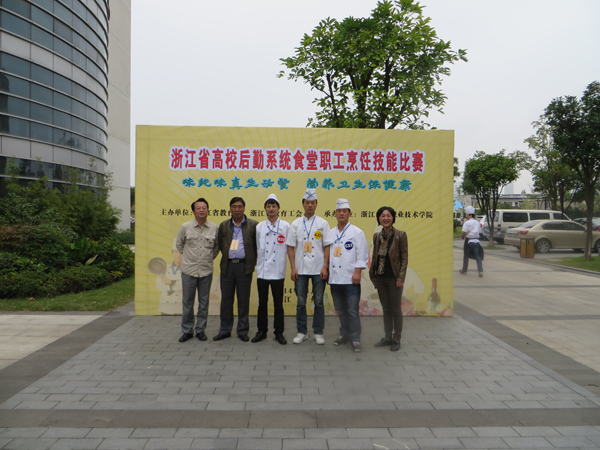 近日,省高校后勤系统食堂职工烹饪技能比赛在浙江商业技术学院举行。我校工会负责人率队参加,后勤员工余珍健(上图右三)取得个人第二名的好成绩。