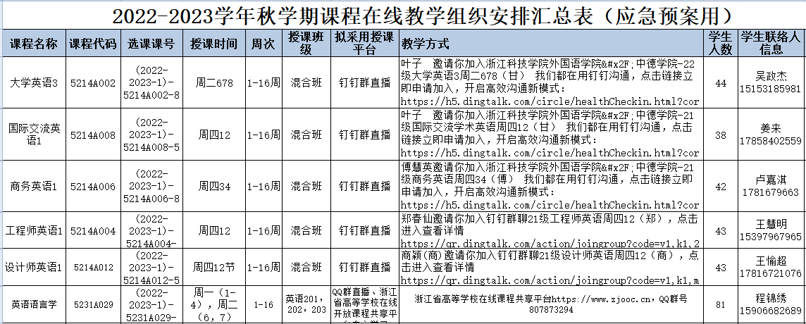 (在线教学应急预案表)