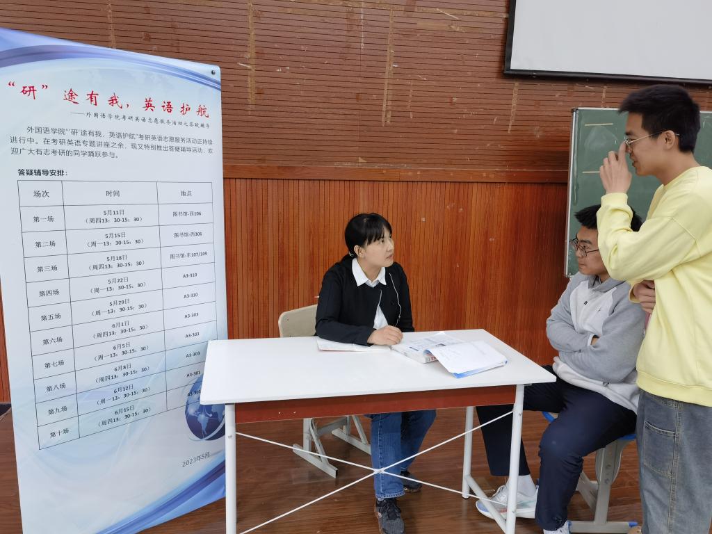 “我觉得阅读理解比较困难,特别是长难句的断句很有挑战,老师能提供一些指导吗?”“我的词汇量总是难以扩大,不知老师有没有一些好的单词记忆方法可以推荐?”“真题和模拟题怎么选择,哪个对提高成绩更有帮助,老师能给点建议吗?”5月11日,在小和山校区图书馆考研自习室外,由外国语学院设立的“研”途有我 英语护航志愿服务点外,前来咨询的学生络绎不绝。